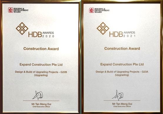 Expand Construction had received HDB Construction Award (Upgrading category) in year 2020 and 2021, in recognition for its outstanding performance in project management, construction quality, public relations, as well as innovation and re-engineering solutions in resolving site constraints.