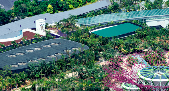 The Energy Centre is the "pumping heart" of the Gardens By The Bay at Marina Bay South. It produces energy and distributes it to the entire development through its complex network of mechanical and electrical pipings. It houses chillers, generators and eco-recycling plant to supply hot and cold water as well as steam necessary for the energy needs of the Conservatories. HT and LT switch rooms, BMS and FCC rooms are also located in the Energy Centre to generate power supply to the Supertrees, F&B outlets and other amenities buildings within the development. It is largely underground with connections both to the external air through the discharge ducts built into the Supertrees and to the Biomes. The areas and buildings served by the Energy Centre include the Cool Moist Biome, the Cool Dry Biome, the Support Biome, the Hub and Visitor Centre, the Supertrees Restaurant and the Support Buildings.