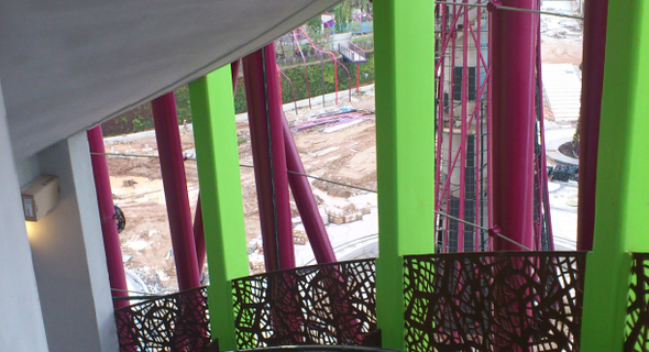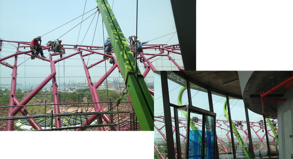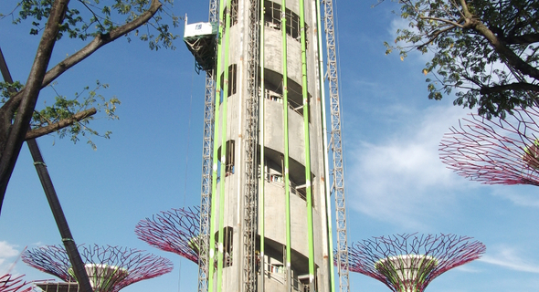 This project has not one but twelve Supertrees with many of the canopies at arm's length to one another. The Supertrees provide shade in the day come alive with an exhilarating display of light and sound at night. The biggest Supertree is as tall as a 16-storey building with a canopy that stretches the length of an Olympic swimming pool. It also has a rooftop restaurant with panoramic views of the Marina Bay area.